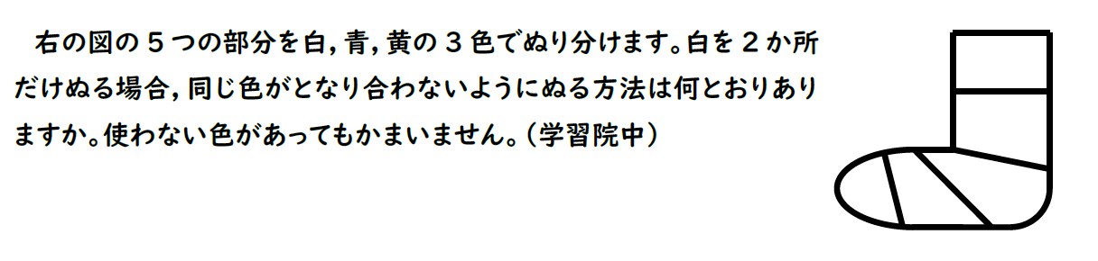 右の図の5つの部分を白・青・黄の3色で塗り分けます。